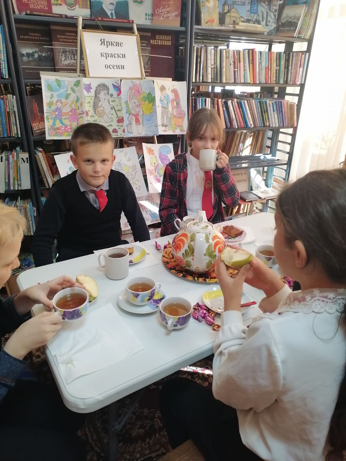 Осень – самая яркая пора, которую воспевали поэты и художники. Красота осенней природы никого не оставляет равнодушным. Ребята вспомнили какая бывает осень: радостная, богатая урожаем, пышно убранная, грустная с каплями мелкого дождя. Но все равно земля в это время года всегда прекрасна и очаровательна. Все это дети постарались отобразить на бумаге. Рисунки получились разнообразные и прекрасные, ведь детская фантазия не знает границ. Трудно было определить победителя, поэтому все получили сладкие призы. Мероприятие закончилось чаепитием с ароматным чаем с заваркой осенних трав.